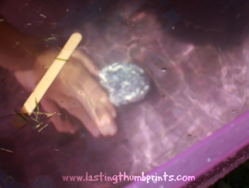This was a fun experiment and the kids really got into it. (Perhaps growing a baby is taking up all my brain cells right now, but I couldn’t think of a good way to do this with pool noodles.) A handful of coins that would normally sink on its own was able to float on a large piece of aluminum. We talked about boats and how many times the cargo they carry would sink if thrown overboard. Then it was time to change the surface area and see what would happen…