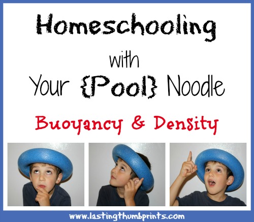 What better way to introduce the concepts of buoyancy and density than with pool noodles! You can really tailor this idea to fit a wide range of ages. Our 13 year old joined in some of the conversation, but most of the activities we did were focused on our younger students. I wish I had more pictures, but we were just having too much fun and I didn’t want to interrupt the natural flow of learning that was taking place.