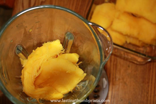 Cut the meat of the pumpkin into slices and place a few of them into a blender or food processor to puree. I don’t have a food processor, so this is being made in a blender. When using a blender, you may have to add just a bit of water in order for it to process fully. I like to use some of the liquid released when I initially cut the cooked pumpkin for this.