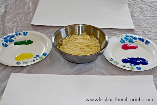 I have to admit that I loved it when my kids sat down at the table ready to paint and asked where the paint brushes were. But I loved watching their faces even more when I told them we were using the spaghetti to paint. Clearly it’s been a long time since I’ve done something out of the ordinary.