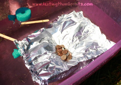 This was a fun experiment and the kids really got into it. (Perhaps growing a baby is taking up all my brain cells right now, but I couldn’t think of a good way to do this with pool noodles.) A handful of coins that would normally sink on its own was able to float on a large piece of aluminum. We talked about boats and how many times the cargo they carry would sink if thrown overboard. Then it was time to change the surface area and see what would happen…