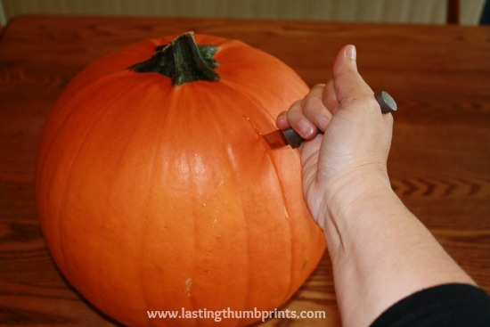 Cut slices around the pumpkin with a knife. I usually make anywhere from 8-12 slits about an inch long. I got a little carried away on my first one.