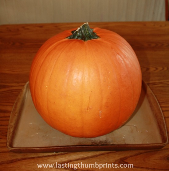 Place your pumpkin on a cookie sheet or in a baking dish. Which you probably will want to do after you clean the pumpkin, but I apparently wasn’t thinking clearly on this day.