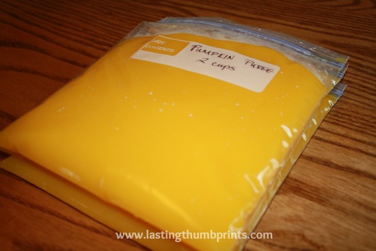 I freeze the majority of my pumpkin puree in 1 cup and 2 cup portions since that is what I use in most of my pumpkin baking. I know that if I freeze larger portions then I may not use it all when it’s thawed no matter how good my intentions.