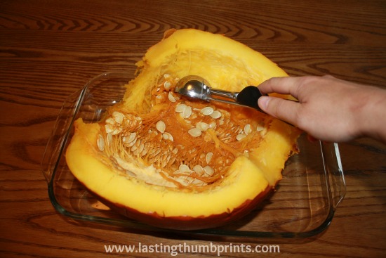 Once your pumpkin has fully cooked, let it cool for about 20-30 minutes. After it has cooled a bit, cut the pumpkin in half. Or you could cut the pumpkin in half before you let it cool. Whichever floats your boat.