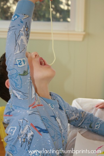 A couple of noodles went in mouths instead of on paper. Perhaps a homemade edible paint would have been a smart choice…