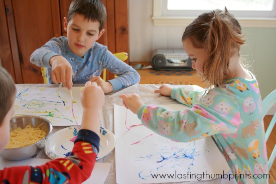I have to admit that I loved it when my kids sat down at the table ready to paint and asked where the paint brushes were. But I loved watching their faces even more when I told them we were using the spaghetti to paint. Clearly it’s been a long time since I’ve done something out of the ordinary.